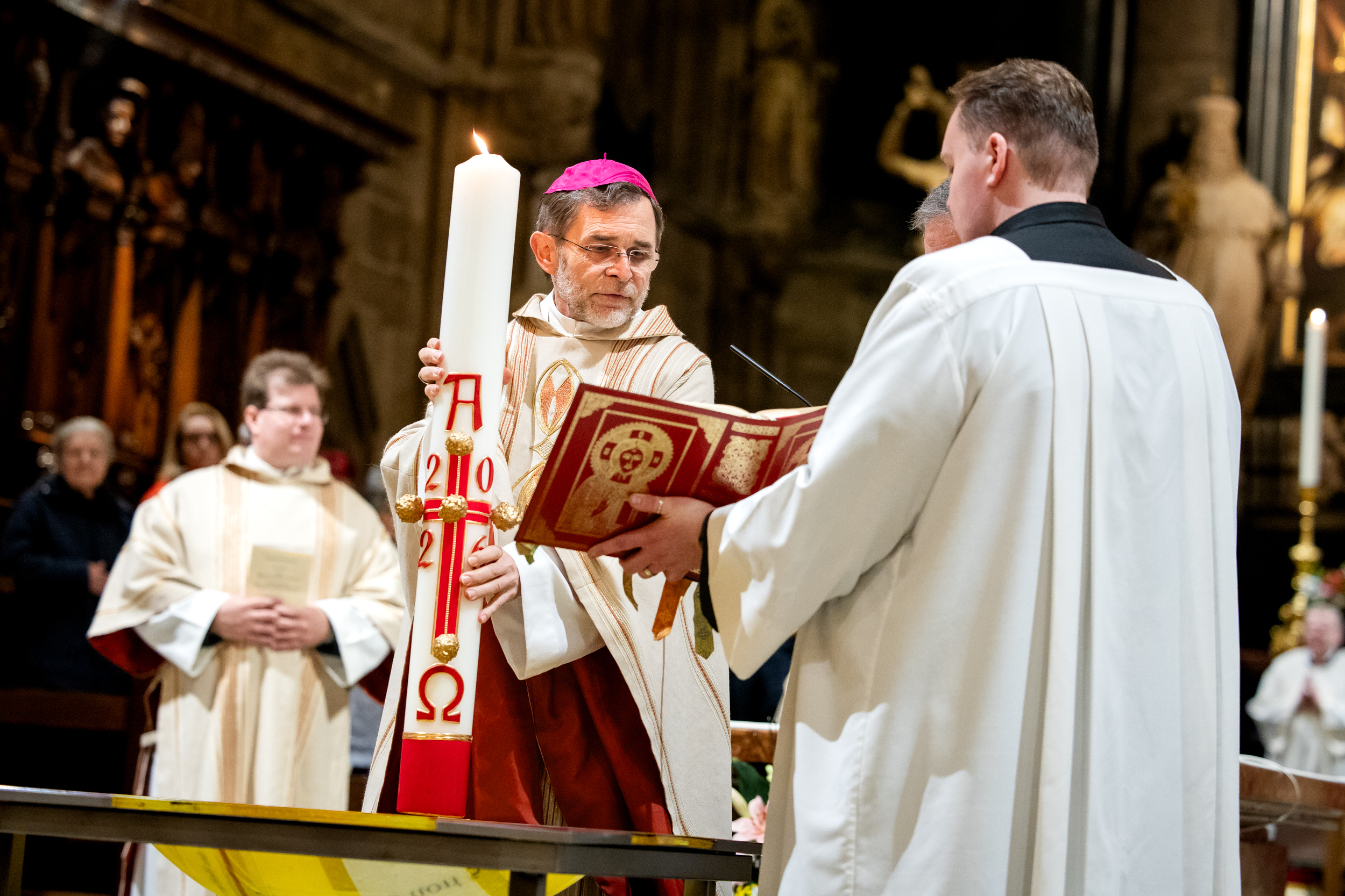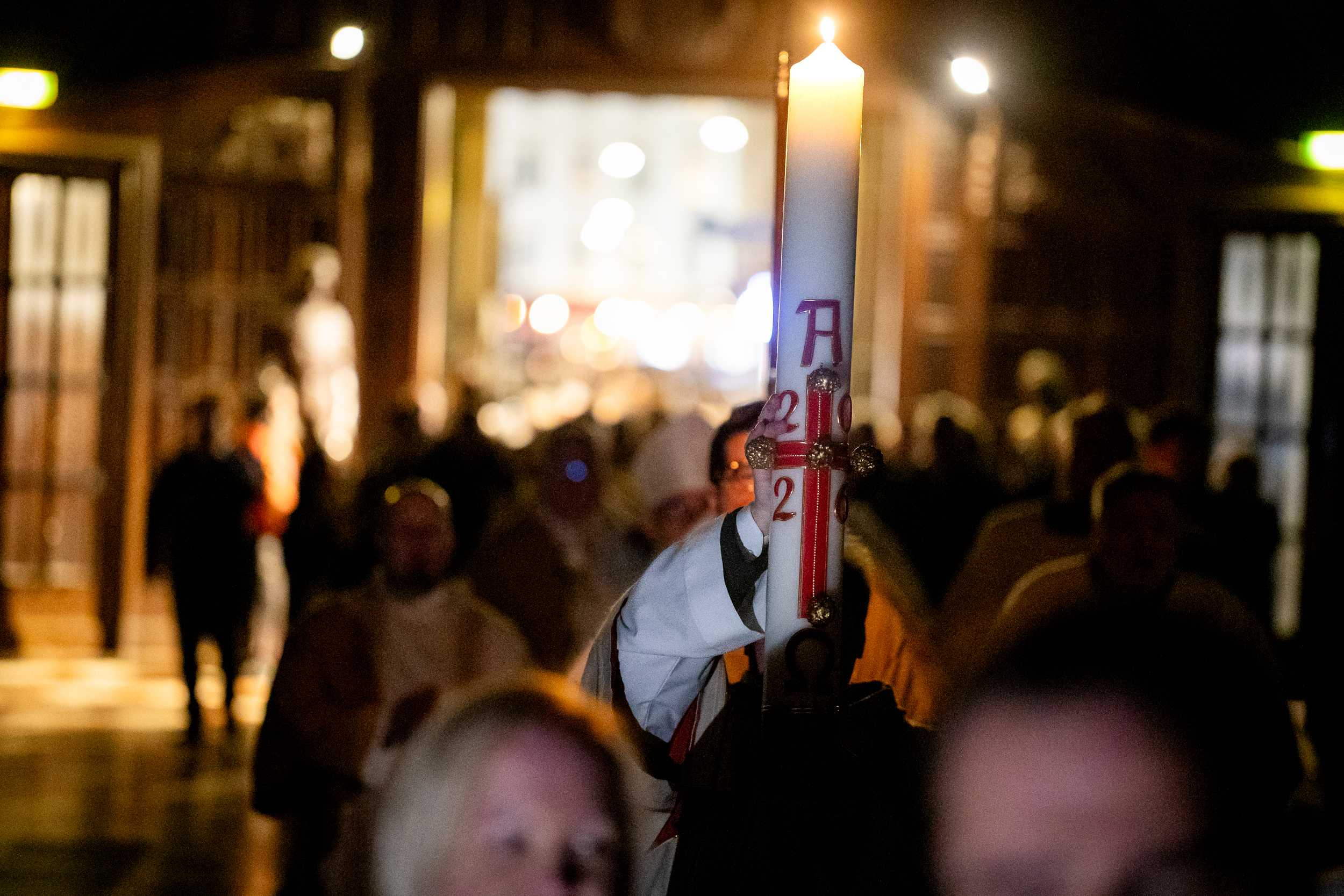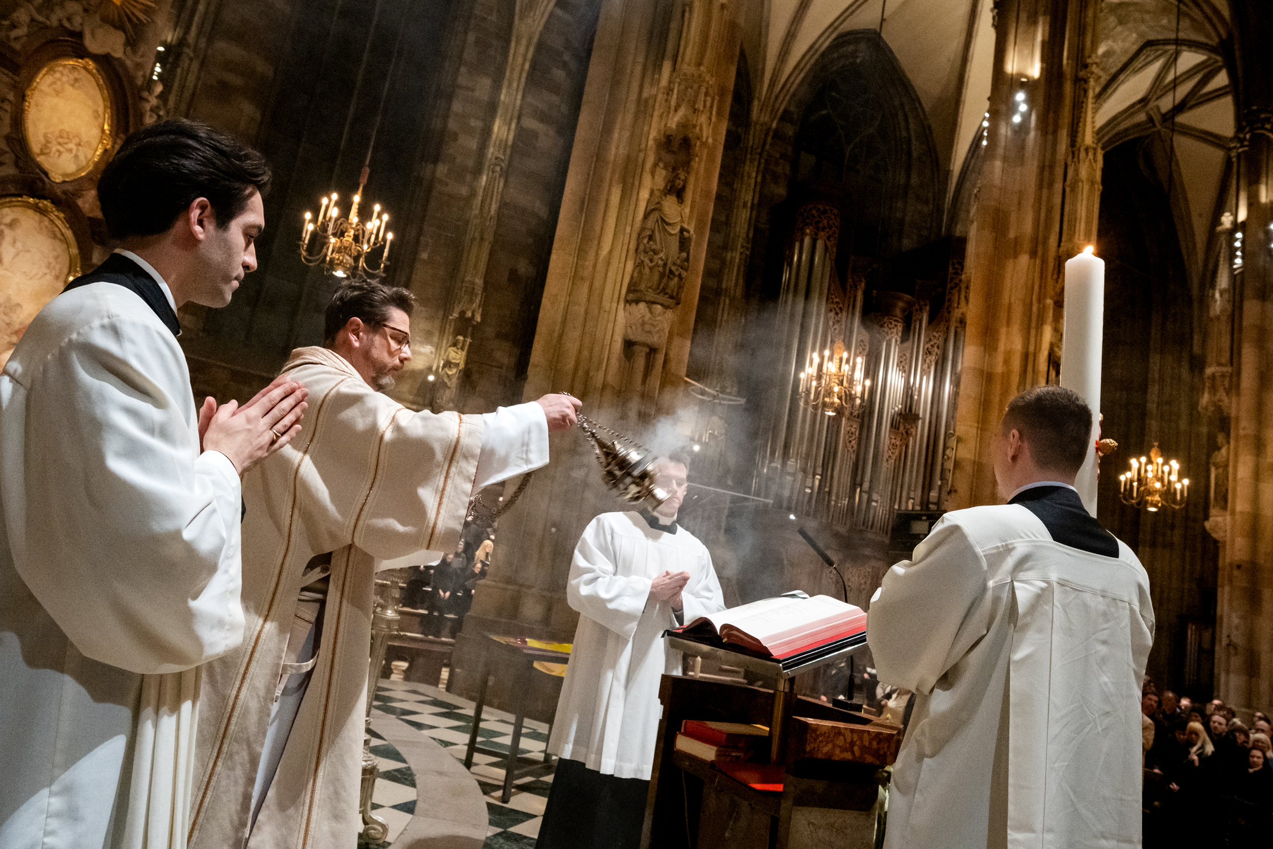 Die Osternacht ist die Feier des Lebens. Ihre Liturgie besteht aus vier Teilen – der Lichtfeier, dem Wortgottesdienst, der Tauffeier und der Eucharistiefeier. Die Lichtfeier beginnt außerhalb des Doms im Hof des Erzbischöflichen Palais. Hier wird die Osterkerze am Osterfeuer entzündet und zum Dom getragen – damit beginnt die Feier der Osternacht. Wir waren mit der Kamera dabei – unter der Leitung unseres Erzbischofs Josef Grünwidl.